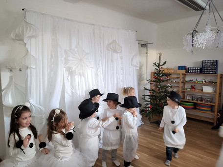 Děti měly připravená krásná tematická vystoupení s tanečky, písničkami a básničkami v českém a anglickém jazyce. Nejstarší třída Blue měla veselé vánoční téma Jingle Bells, nejmladší dětí ve školce vystupovaly jako malé paní Klausové a Santové a v lednu nám třída Yellow připravila zasněžený program plný sněhových vloček a dokonce vyzvala k tanci i rodiče.